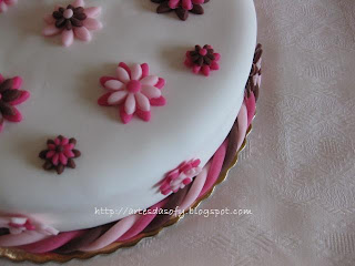 Para a decoração usei a pasta de açucar em tons branco, rosa bébé, rosa choque e o castanho e foi este o resultado:
