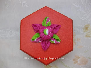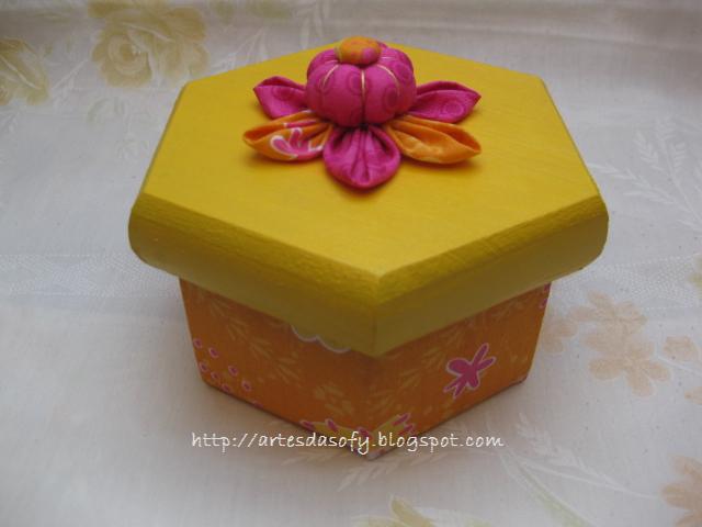 Caixa forrada com tecido e fuxico na tampa em tons rosa, amarelo e laranja.